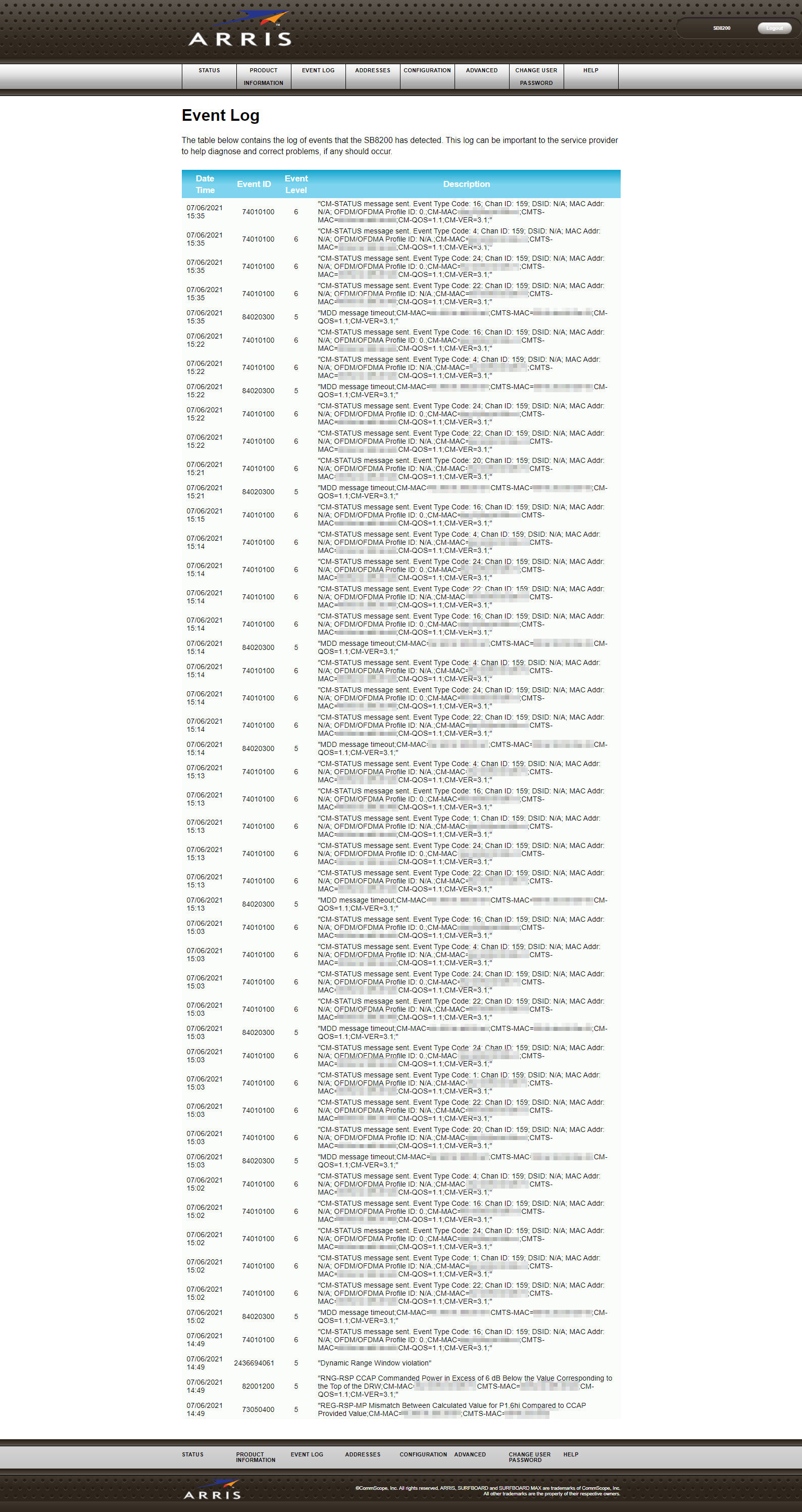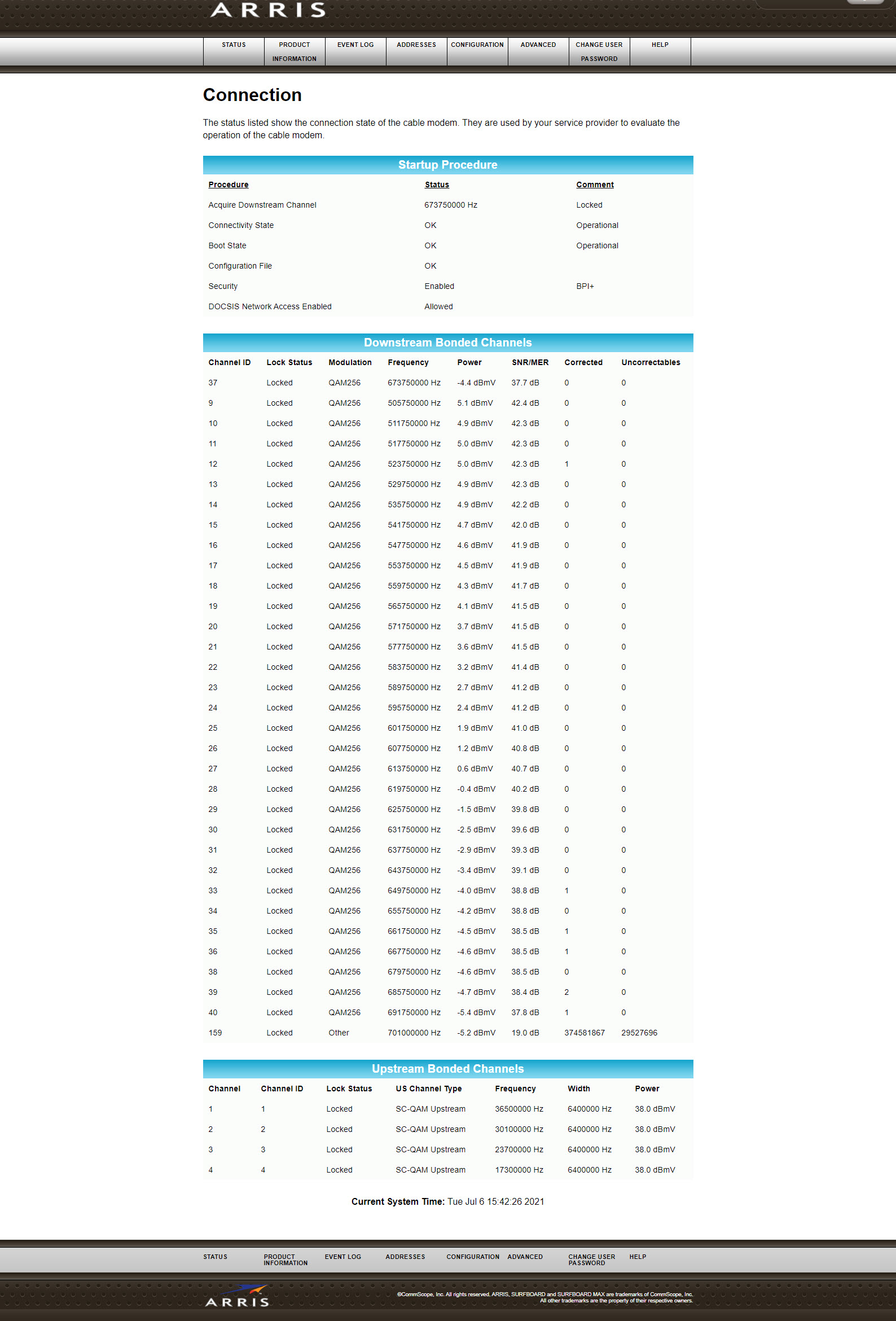The kicker is that, for some reason, I have not been able to log into my cable modem (an ARRIS SB8200) like I have in the past so I could access signal strength to pass that along. Tried a hard reset with no joy. It just won't let me into its admin. (I get as far as it asking me for user and pass but that's it; it won't let me use the last 8 digits of my modem's serial even after a hard reset.)