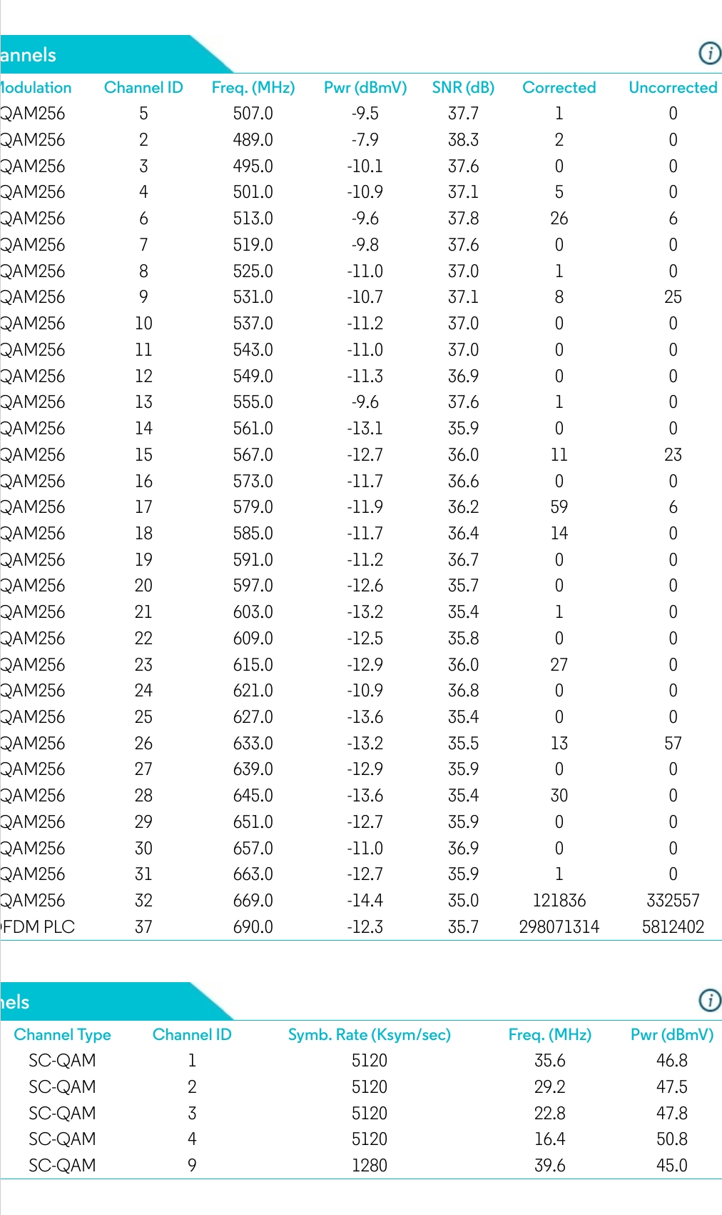 Please also post the *Downstream Power Level*, the *Upstream Power Level*, and the *SNR* (Signal to Noise Ratio) numbers.